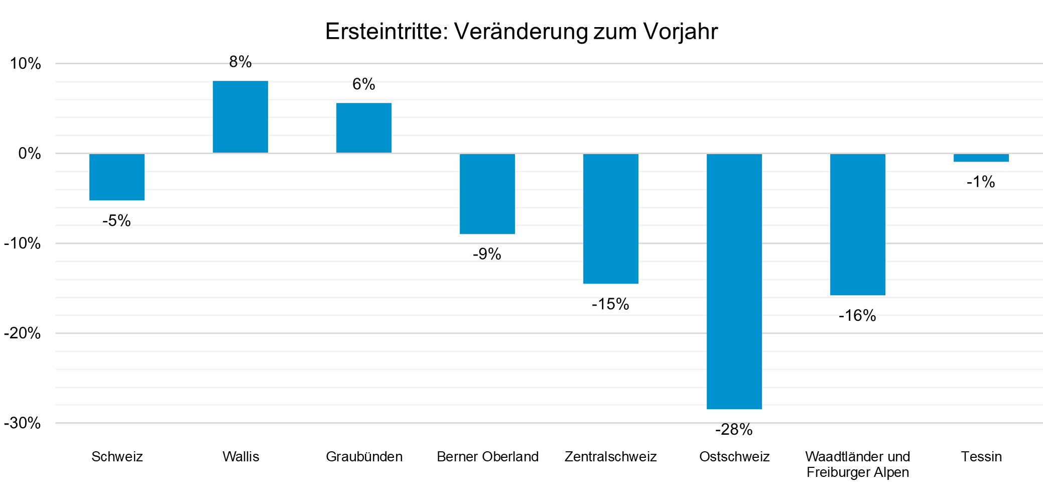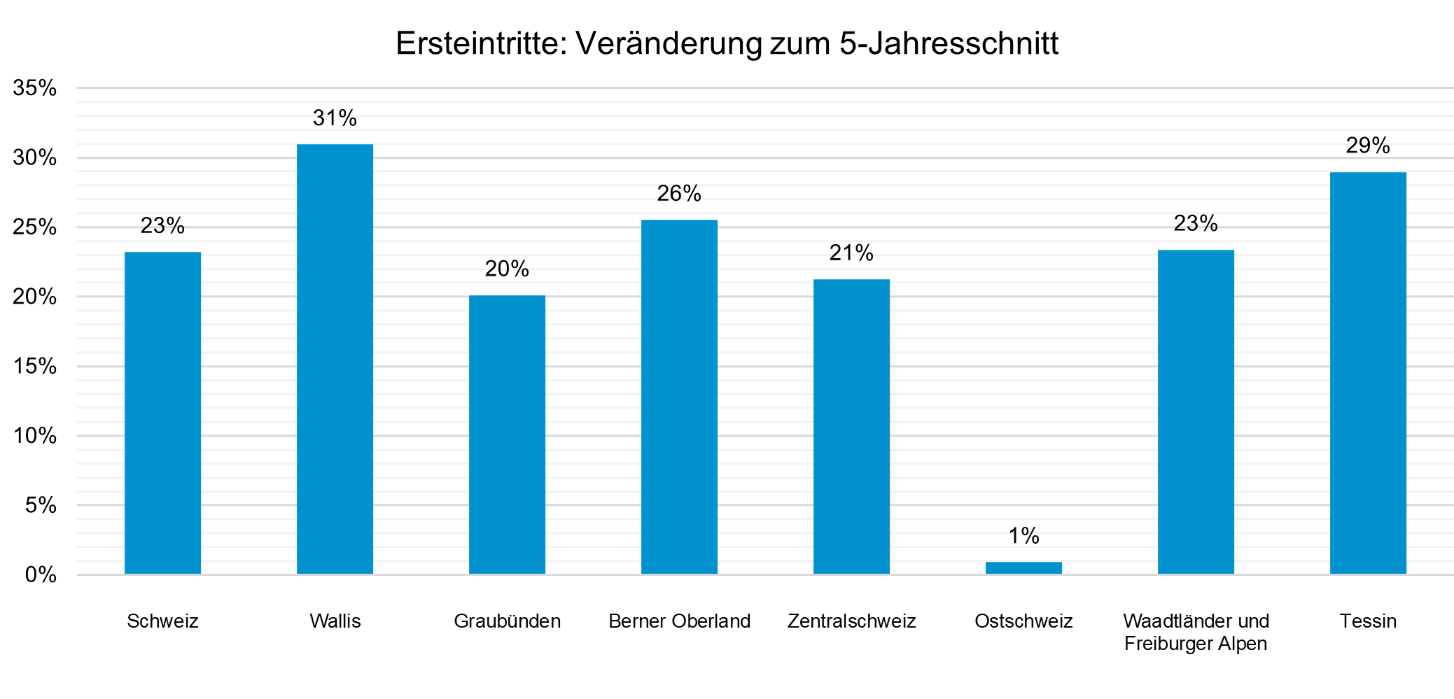 So konnte ein Zuwachs von 23 Prozent bei den Ersteintritten gegenüber dem 5-Jahresschnitt verzeichnet werden. Die Zuwachsraten sind auch hier unterschiedlich hoch und liegen zwischen 1 Prozent in der Ostschweiz und 31 Prozent im Wallis.