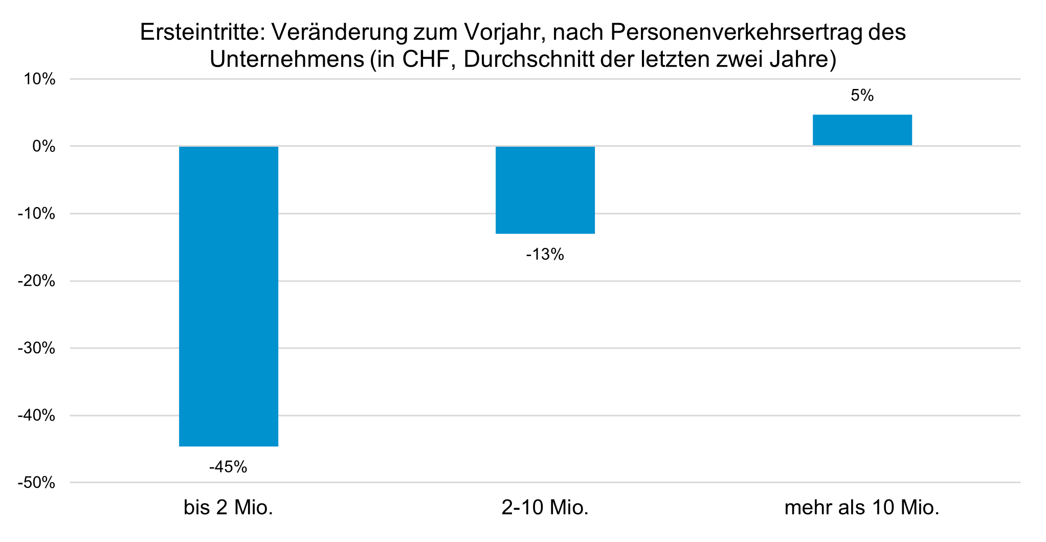 Analysiert man die Veränderung der Gästezahlen an der Unternehmensgröße (gemessen am Verkehrsertrag), so zeigt sich ein ähnliches Bild: Kleine Unternehmen, häufig in tiefen Lagen, verzeichnen einen deutlichen Rückgang der Gästezahlen, während große Unternehmen einen leichten Zuwachs von 5 Prozent verzeichnen konnten.