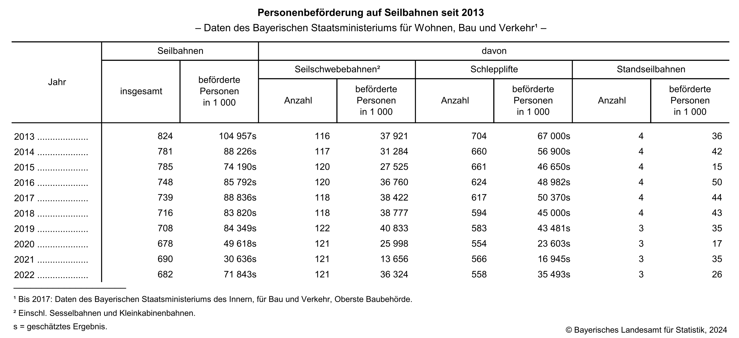 Wie das Bayerische Landesamt für Statistik jetzt – 2024 – mitteilt, gab es in Bayern im Jahr 2022 insgesamt 682 Seilbahnen. Davon sind 121 Seilschwebebahnen einschließlich Sessel- und Kleinkabinenbahnen.
