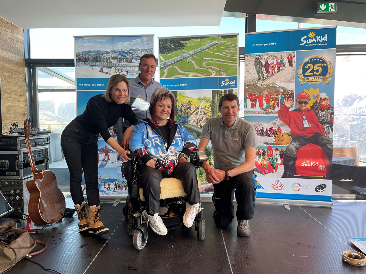 Von links: Marlies Raich, Skirennläuferin, Benny Pregenzer, Geschäftsführer Fisser Bergbahnen, Marianne Hengl, Obfrau von RollOn Austria und Emmanuel Wohlfarter, Geschäftsführer von SUNKID.