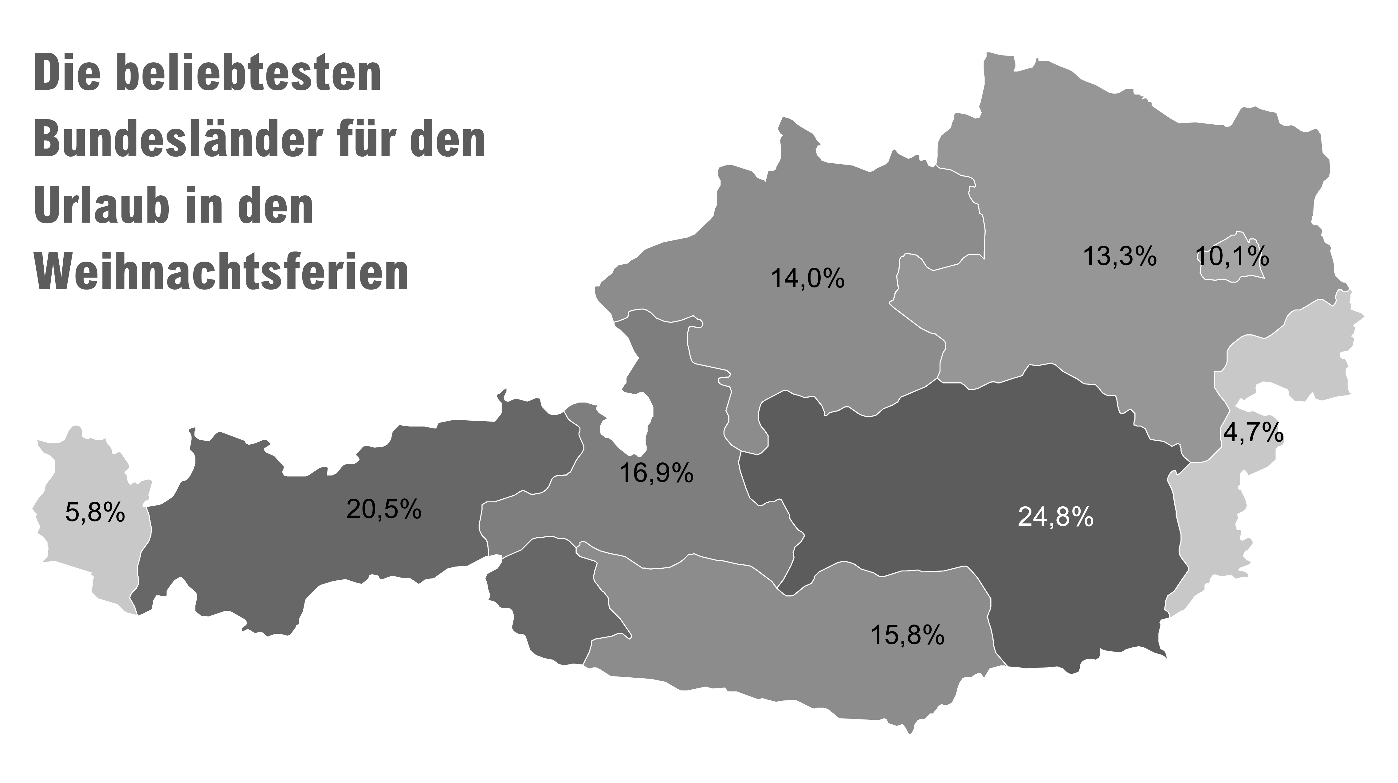 Weniger interessant für den Winterlaub sind die Bundesländer Wien (10, 1 Prozent), Vorarlberg (5,8 Prozent) und das Burgendland (4,7 Prozent)