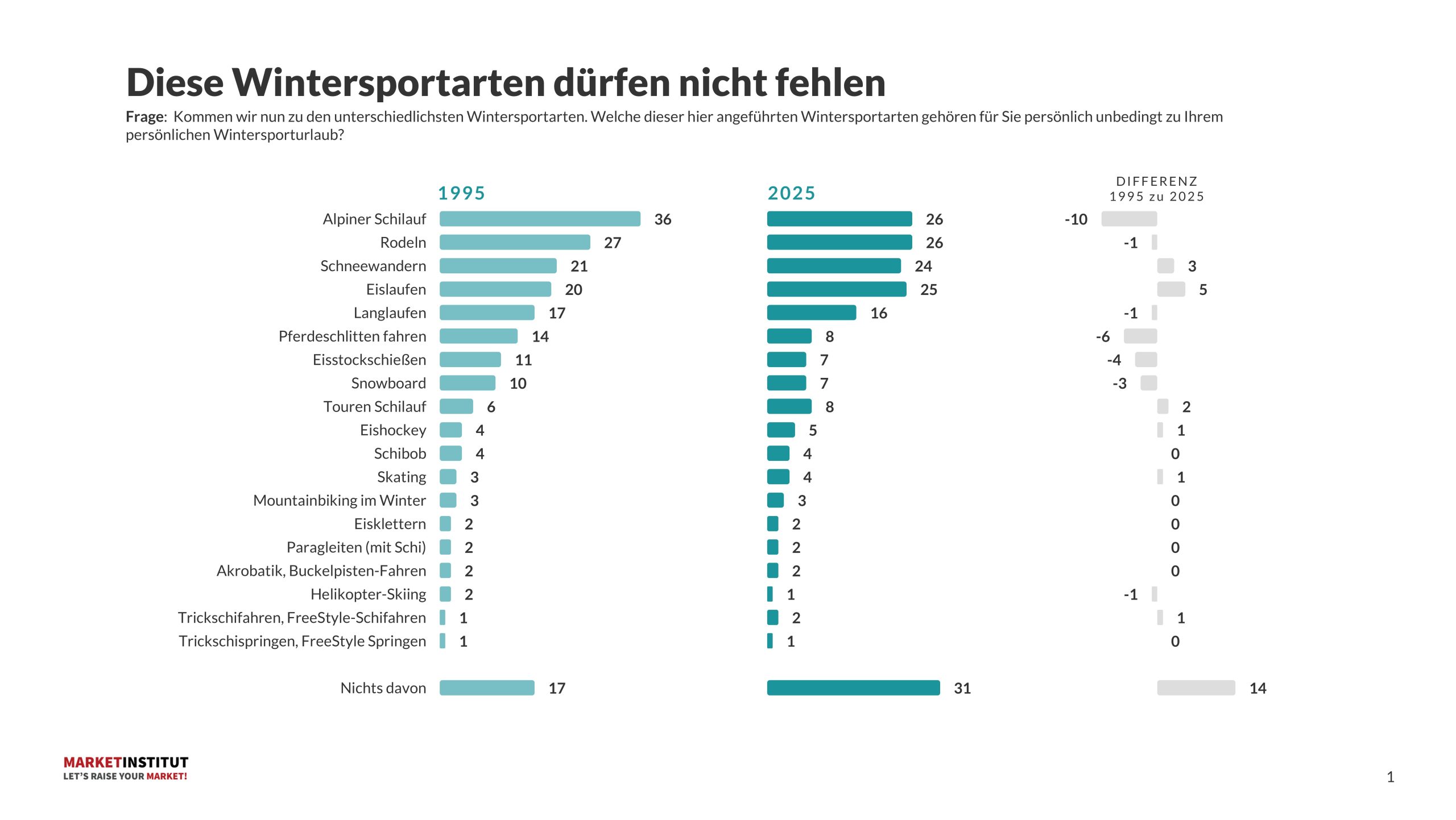 Im Gegensatz zu 1995 gibt es somit keine dominante Wintersportart mehr, sondern eine stärkere Fragmentierung der Interessen. Der Wintersport wird vielfältiger, aber auch weniger klar fokussiert auf einzelne Aktivitäten. Dies spricht für individuellere und flexiblere Freizeitgestaltung.