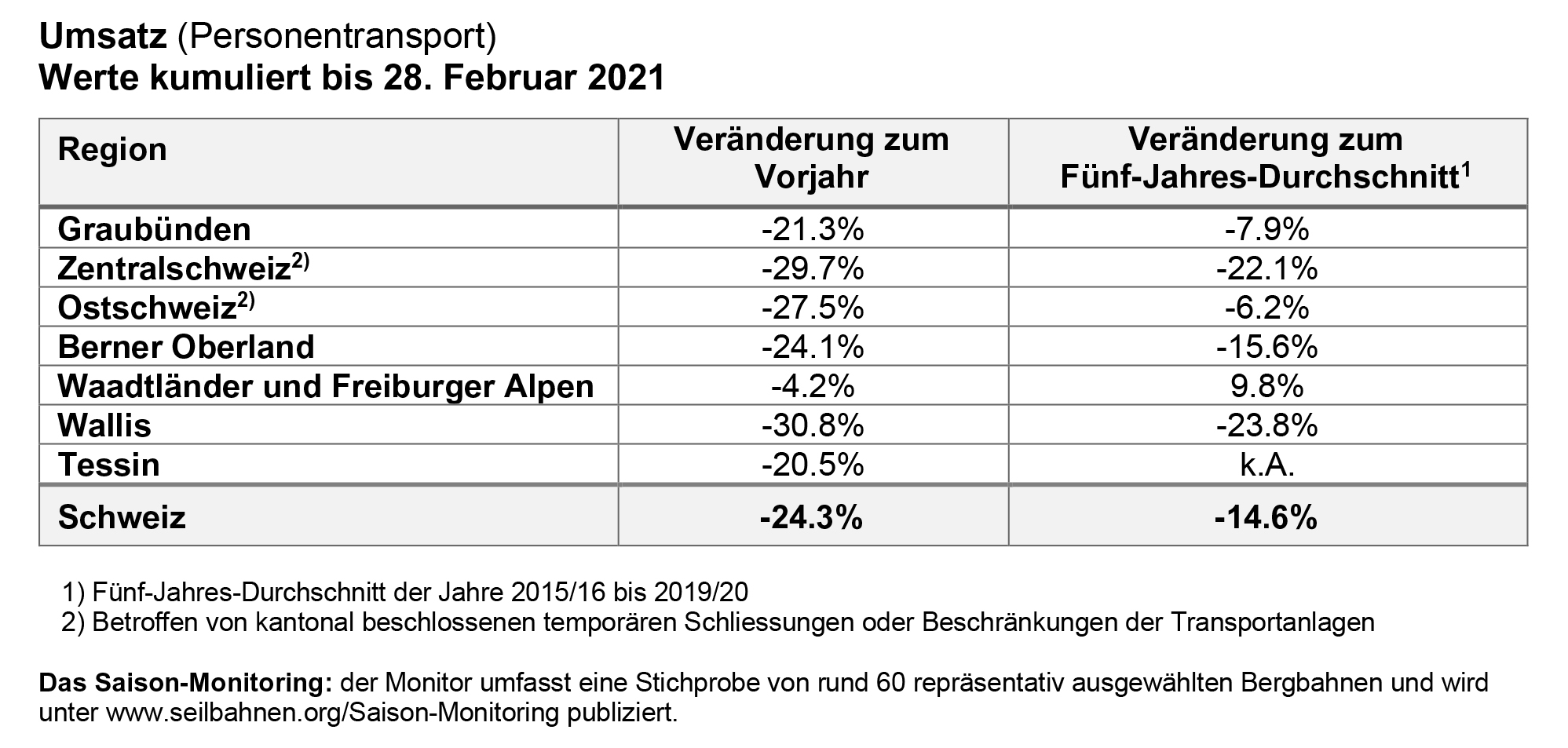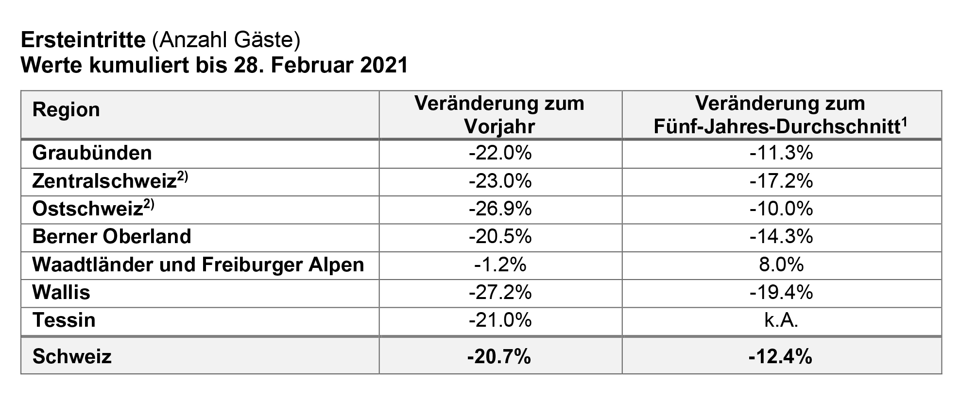 Schweizweit gesehen sind die kumulierten Werte Ende Februar zwar leicht besser als noch im Januar. Dazu haben die Sportferien, welche in diesem Jahr eher konzentriert im Februar stattfinden, beigetragen. Dennoch verzeichnen sämtliche Regionen nach wie vor negative Entwicklungen im Vergleich zum Vorjahr, als noch keine Einschränkungen aufgrund von Corona herrschten.