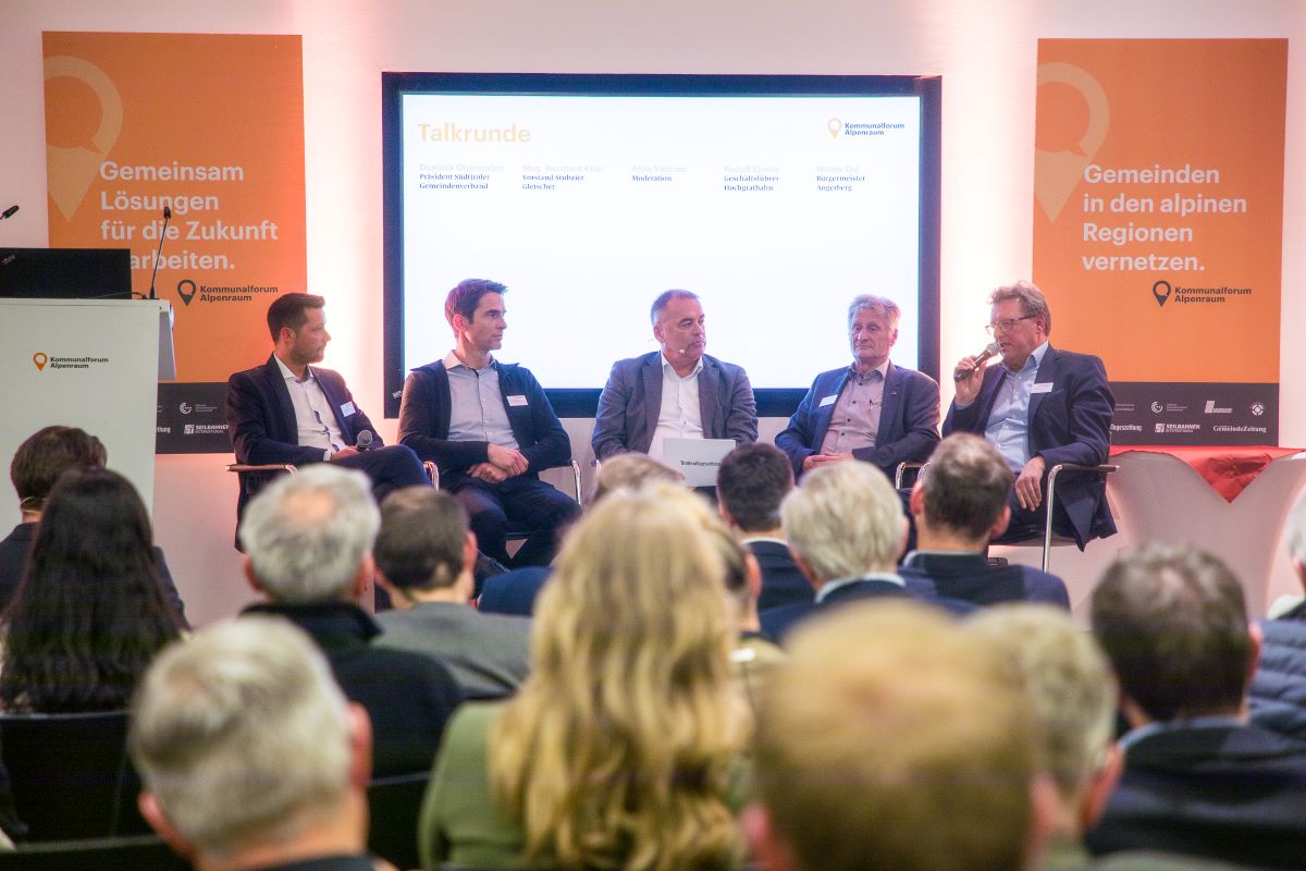 In der abschließenden Talkrunde diskutierten Reinhard Klier (Vorstand Stubaier Gletscher), Rudolf Eberle (Geschäftsführer Hochgratbahn), Walter Osl (Bürgermeister Angerberg) und Dominik Oberstaller (Präsident Südtiroler Gemeindenverband).
