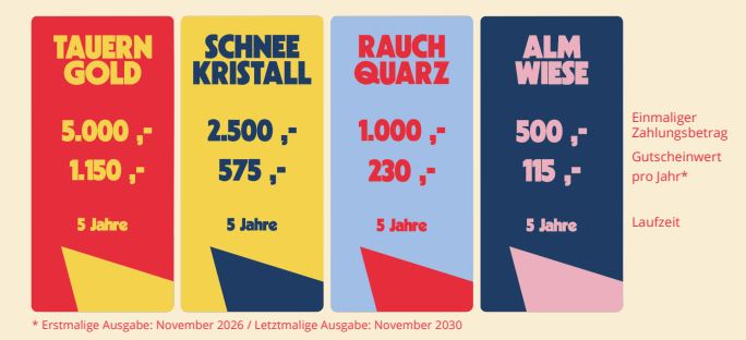 Interessierte an der Finanzierung können eine von vier Investitionsmöglichkeiten wählen und 500, 1.000, 2.500 oder 5.000 Euro in Ankogel investieren. Im Gegenzug erhalten die Investoren Gutscheine über fünf Jahre, beginnend ab 2026.