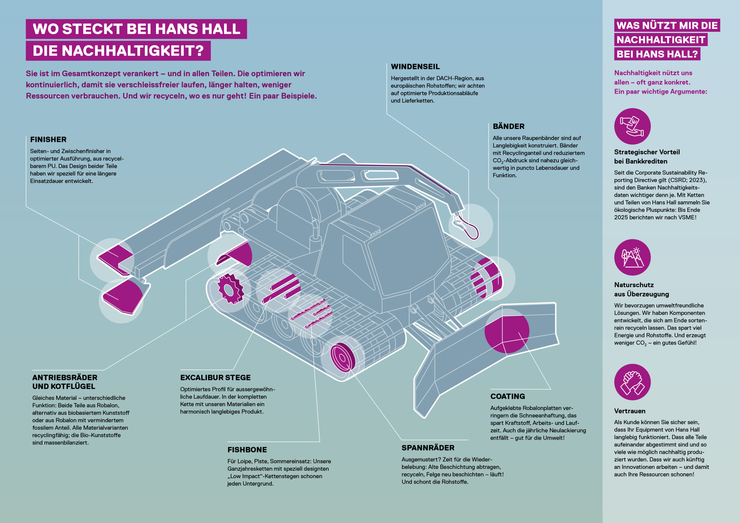 Ein Unternehmen, das dies bereits früh erkannt hat, ist HANS HALL. Der Hersteller von Ketten für Pistenfahrzeuge erstellt nun eine Klimabilanz und forciert die CO2-Reduktion vom Materialeinkauf über die Fertigung bis zu finalen Produkten.