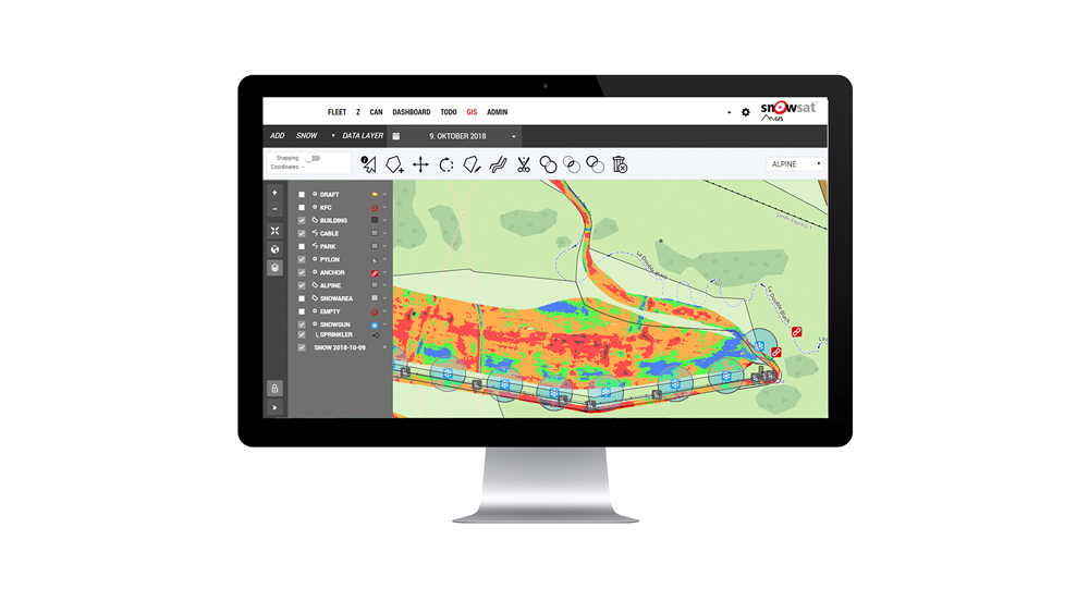 Das Geo-Informations-System (kurz: GIS) eines Skigebietes enthält alle räumlichen Daten, die für die tägliche Arbeit relevant sind: Geländeprofil, Pistenränder, Positionen der Schneekanonen, Schneibereiche, Ankerpunkte für Pistenfahrzeuge, Straßen, Gebäude und viele mehr.