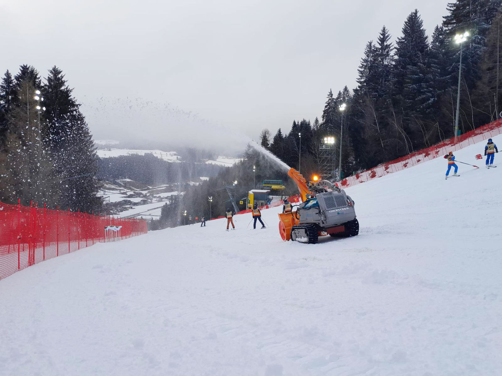 Sollte in den letzten Tagen vor oder zwischen den Rennen Neuschnee fallen kommt der Moritz zum Einsatz, um diesen mit einer angebauten Schneefräse über die Sicherheitszäune und damit außerhalb der Rennstrecke zu schleudern.