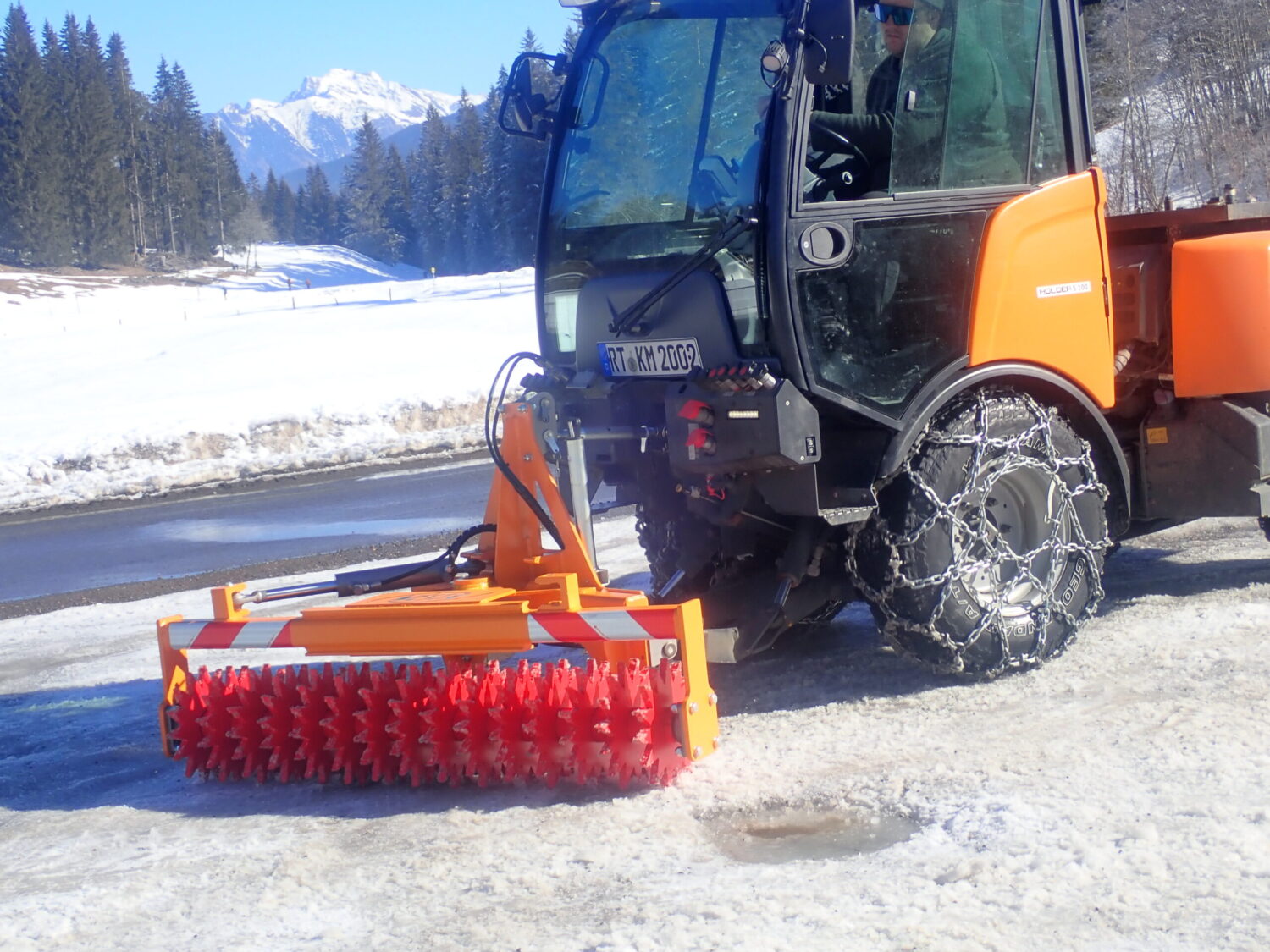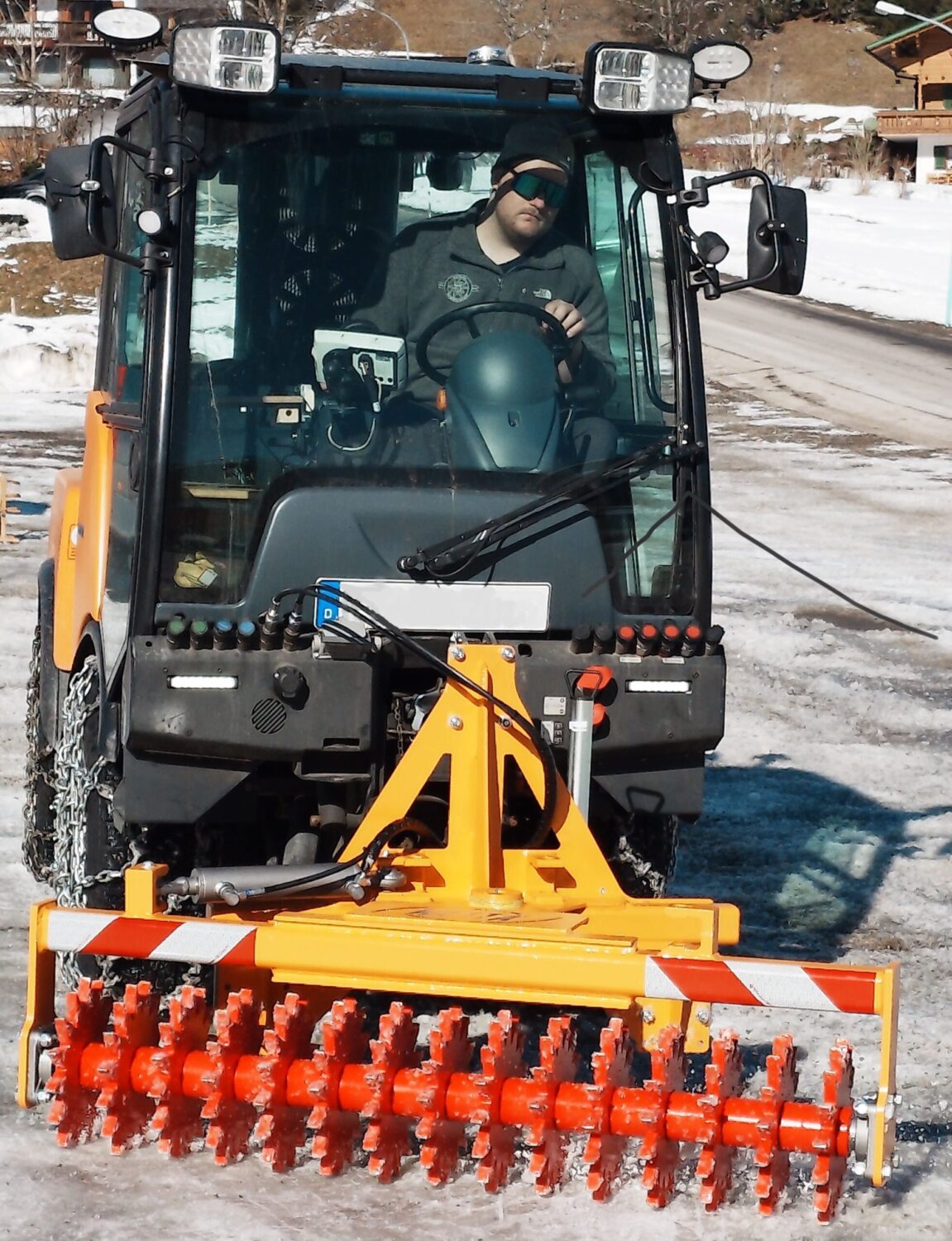 „Beim Anblick einer Egge an einem Traktor kam mir dann die Idee, eine schräg stehende Eisrolle zu bauen“, so Schneider. Gesagt, getan. Die Erfahrungen mit dem Prototypen waren dabei so gut, dass der Bauhof in Lech Jörg Bantel kontaktierte, den Kommunaltechnik-Lieferanten der Gemeinde.