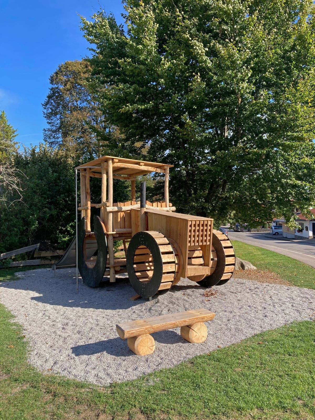 Natürlich darf auch der Spaß nicht zur kurz kommen: Spielstationen locken damit und fördern darüber hinaus auch gleich noch motorische Fähigkeiten, wie etwa der hölzerne, etwa vier Meter hohe Traktor.  Das einzigartige, speziell für Obermaiselstein entworfene Multifunktionsgerät steht nicht nur für das Grundthema Landwirtschaft.