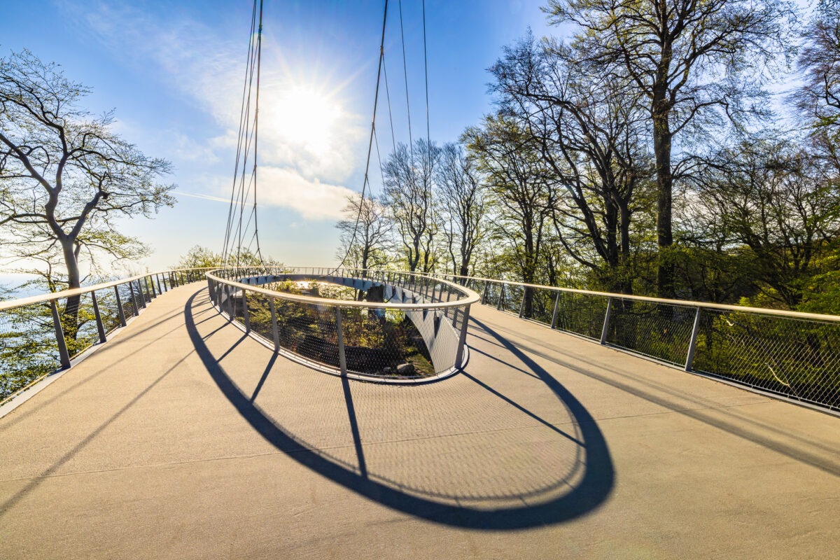 „Spektakuläre Aussichten auf Rügens Kreideküste – der Skywalk Königsstuhl begeistert unsere Gäste. Ein sicheres Betreten der traditionellen Aussichtsplattform konnte durch natürliche Erosionsprozesse nicht dauerhaft gewährleistet werden. Deswegen ersetzt seit April 2023 eine freischwebende, an einem 42 Meter hohen Mast aufgehängte Brücke die bisherige Aussicht und eröffnet völlig neue Perspektiven auf die einzigartige Kreideküste. In Deutschlands kleinstem Nationalpark fügt sich das architektonisch anspruchsvolle Bauwerk trotz seiner imposanten Größe harmonisch in die umliegende Natur ein und ermöglicht erstmals den barrierefreien Zugang für alle Menschen.“