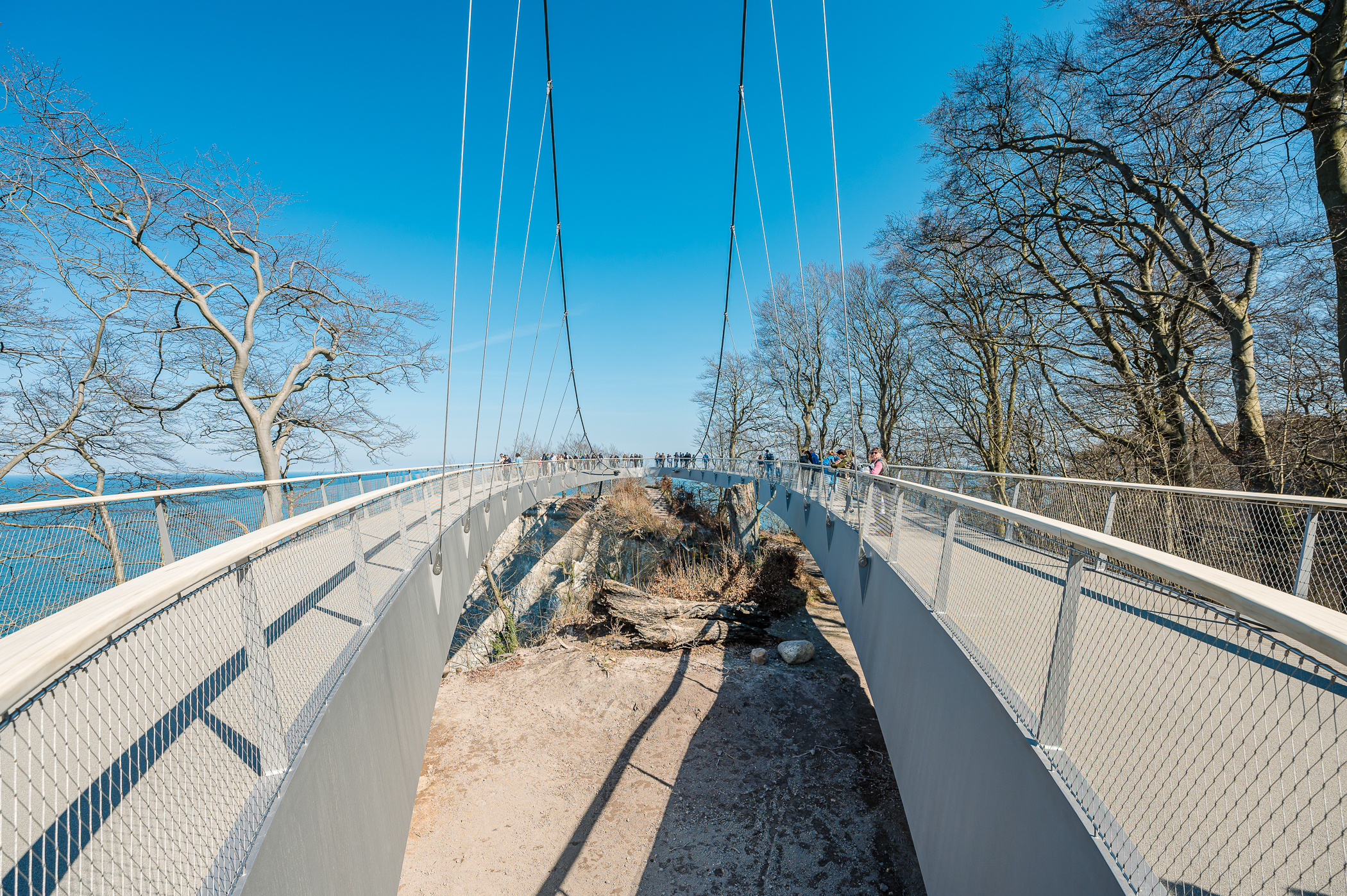 Seit einem Jahr dehnt sich über dem Königsstuhl ein 185 Meter langer ellipsenförmiger Rundweg aus, der das einmalige Naturerlebnis krönt. Der sogenannte „Königsweg“ wird an zwei Tragseilen von einem 42 Meter hohen Abspannmast gehalten und schwebt förmlich über dem Kreidefelsen, auf den er einen seltenen Blickwinkel ermöglicht.