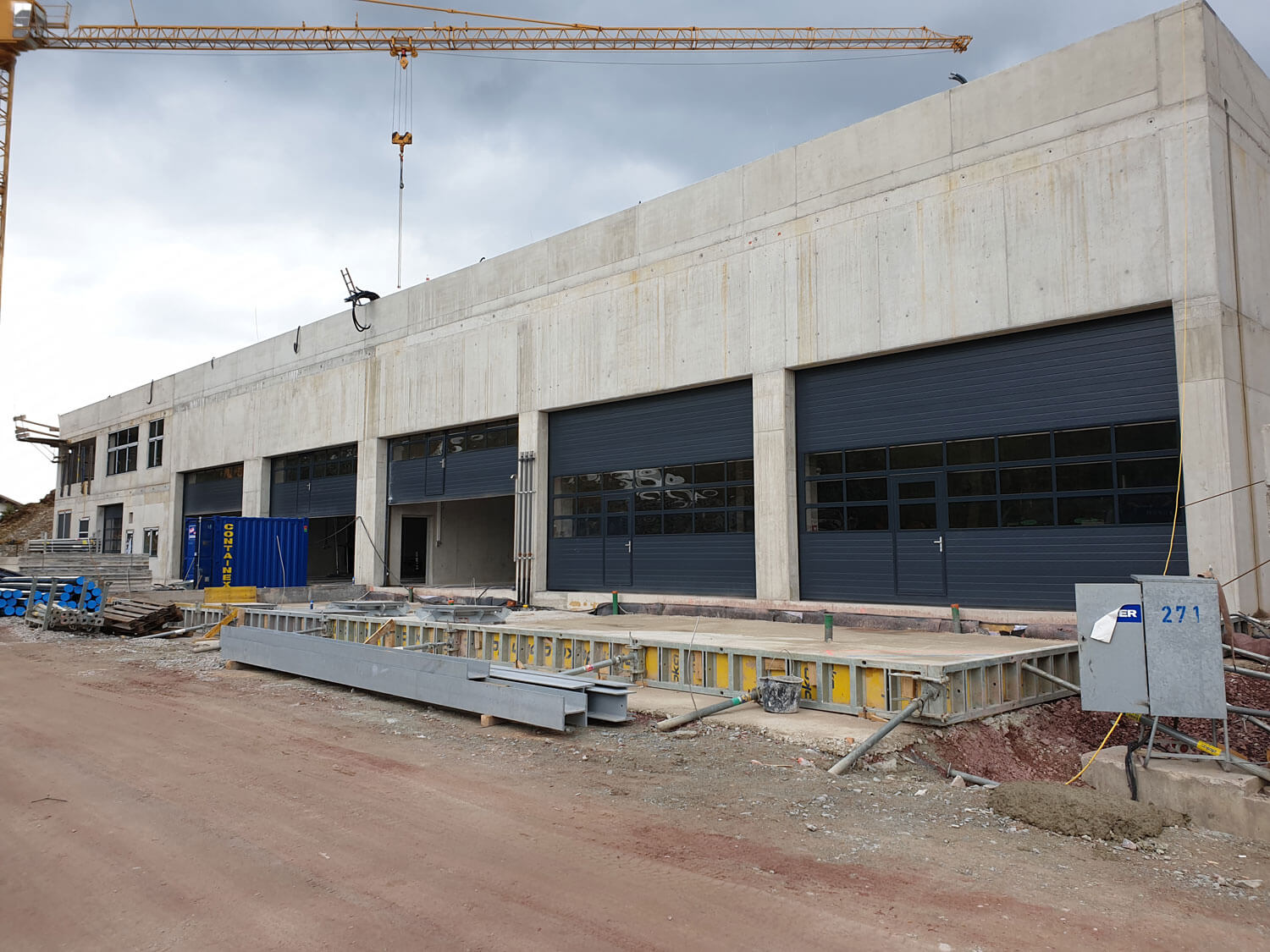 Aufgrund der Größe  (58 Meter Länge, 27 Meter Tiefe und einer Giebelhöhe von rd. 15 Meter)  musste die Baugrube mittels Spritzbeton und Ankern gesichert werden. Durch die tiefe Einschüttung wurde das Gebäude sehr gut in die Umgebung eingebunden. Es ist lediglich eine Front komplett sichtbar. Die Geländeanpassung ermöglicht es, mit Fahrzeugen direkt auf das Dach und in die Zwischengeschosse zu fahren, was die Logistik wesentlich vereinfacht.