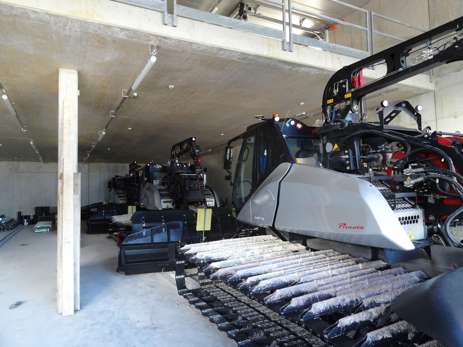 KLENKHART & PARTNER setzten alle Wünsche mit einer innovativen Lösung für viele Bereiche um. Im neuen Technikzentrum, das zentral situiert wurde, sind die Pumpstation samt Kühlturmanlage, Werkstätten für Pistengeräte und Schneigeräte, eine Tankstelle und eben die Garage für alle Pistengeräte untergebracht.