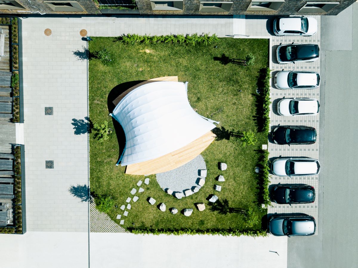 Mit diesem bereits patentieren „FLEXGrid-Aufspannsystem“ wurde nun in Kuchl (Salzburg) ein zehn Meter breiter und vier Meter hoher Pavillon errichtet, die Praxistauglichkeit des Systems ist damit bewiesen.