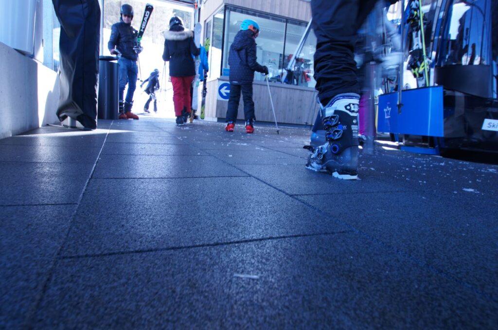 Bei Flächen, auf denen viele nasse Skischuhe auftreten, ist Rutschfestigkeit besonders wichtig. Mit der REGUPOL everroll alpine Matte ist höchste Sicherheit in den Zustiegsbereichen und Skidepots gewährleistet.