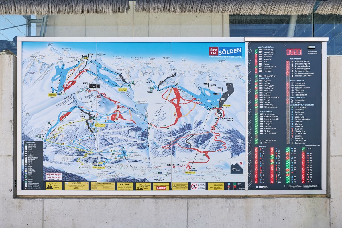 Ein von den Bergbahnen entwickeltes Pistenleitsystem mit großformatigen Orientierungstafeln und realitätsnahen Panoramakarten erleichtert die Navigation im Skigebiet.