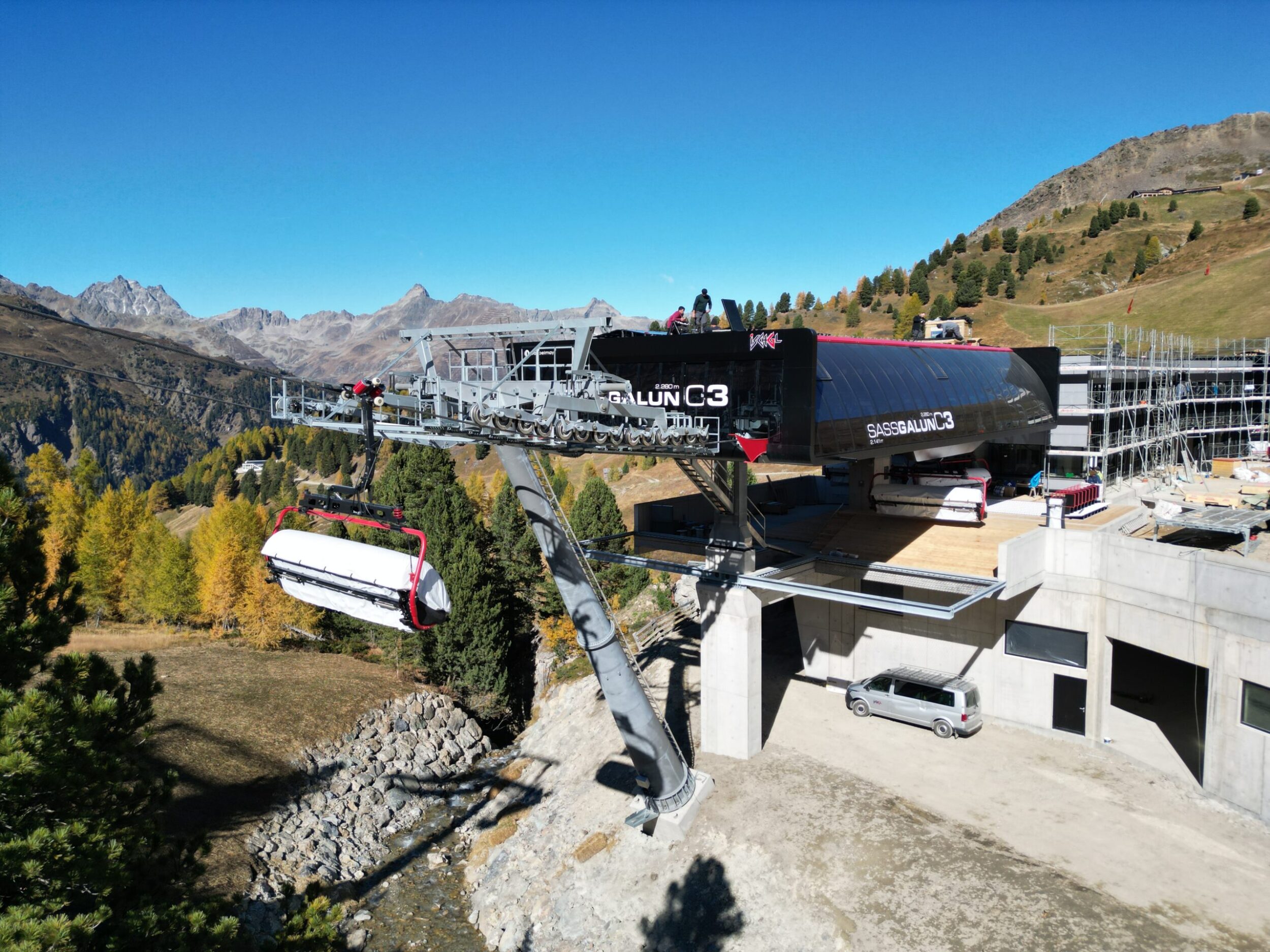 Mit rund 84 Rotationen wurden rund 131 Tonnen Stützenmaterial montiert. Die Sassgalun C3 fährt mit 23 modernen 8er-Sesseln eine Förderleistung von 3.400 Personen pro Stunde – und das auf der Trasse der alten Bahn. Das Seil ist 800 Meter lang und wiegt rund acht Tonnen.