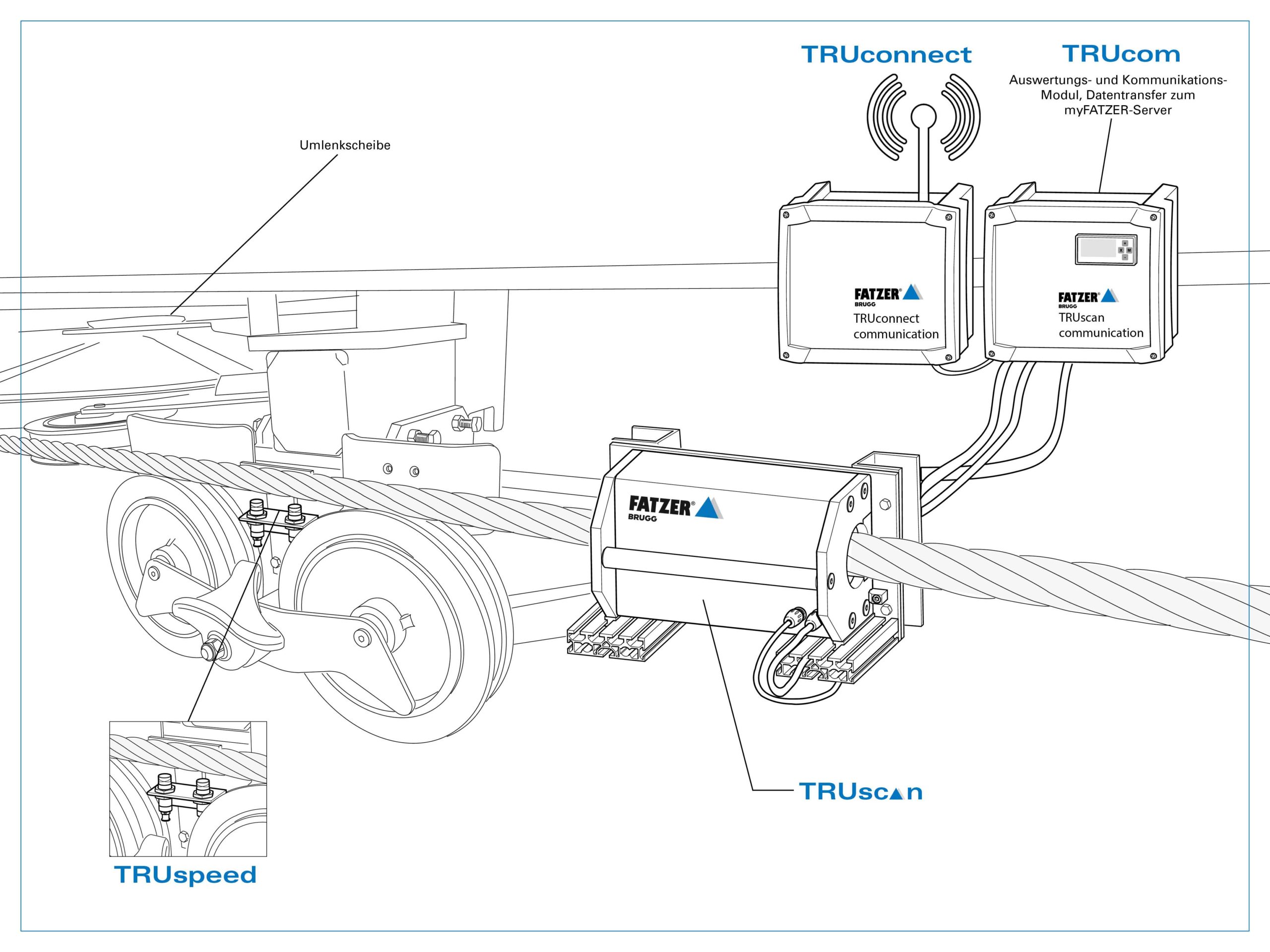 Förder- und Zugseile zählen bei Seilbahnen zu den nicht redundanten Bauteilen, deren Zuverlässigkeit entscheidend für die Sicherheit und Verfügbarkeit des gesamten Systems ist. Das innovative MI-Prüfgerät TRUscan von FATZER sagt mit einer Kombination aus berührungsloser Längenmessung und Drahtbrucherkennung die Ablegereife des Seils präzise voraus.