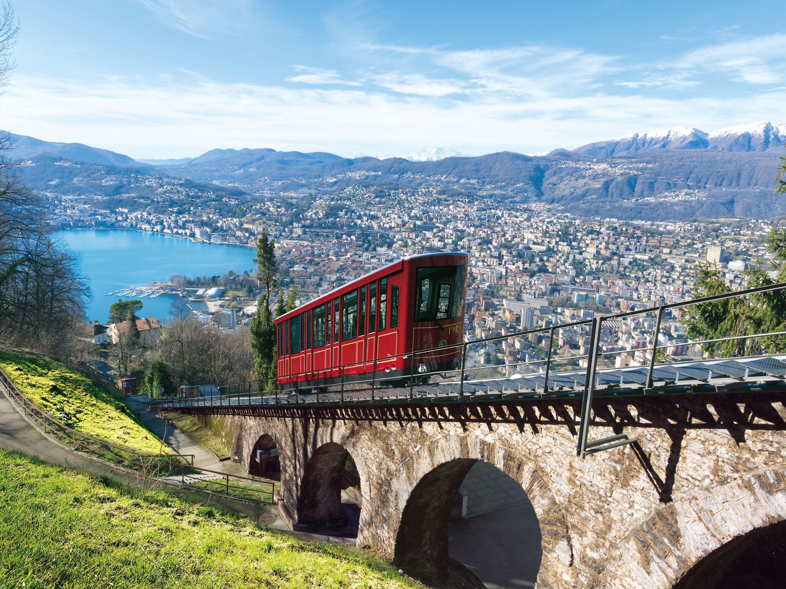 Die zwei barrierefreien Fahrzeuge der Standseilbahn Monte Brè in Lugano sind im Retro-Look gestaltet und bieten Platz für 70 Personen.