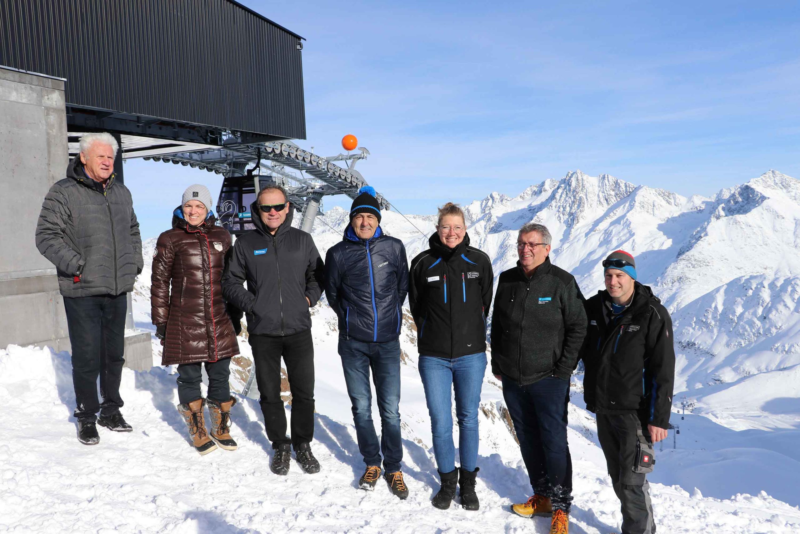 Von links: Eugen Larcher, Michaela Gasser (TVB Tiroler Oberland), Armin Falkner (TVB Tiroler Oberland), Michael Tanzer (Fa. Leitner), Beate Rubatscher-Larcher (Kaunertaler Gletscherbahnen), Josef Raich (Bürgermeister Kaunertal) und Michael Stadelwieser (Betriebsleiter Weißseejochbahn).