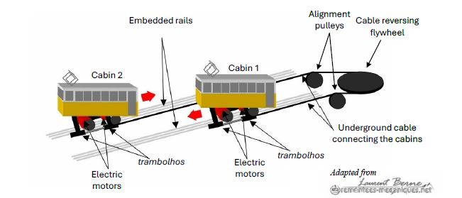 Die Cabinas sind durch ein Seil verbunden, das ihr Gewicht über eine große Umlenkrolle an der Spitze der „Elevador da Glória“ in einem unterirdischen Technikraum ausgleicht.