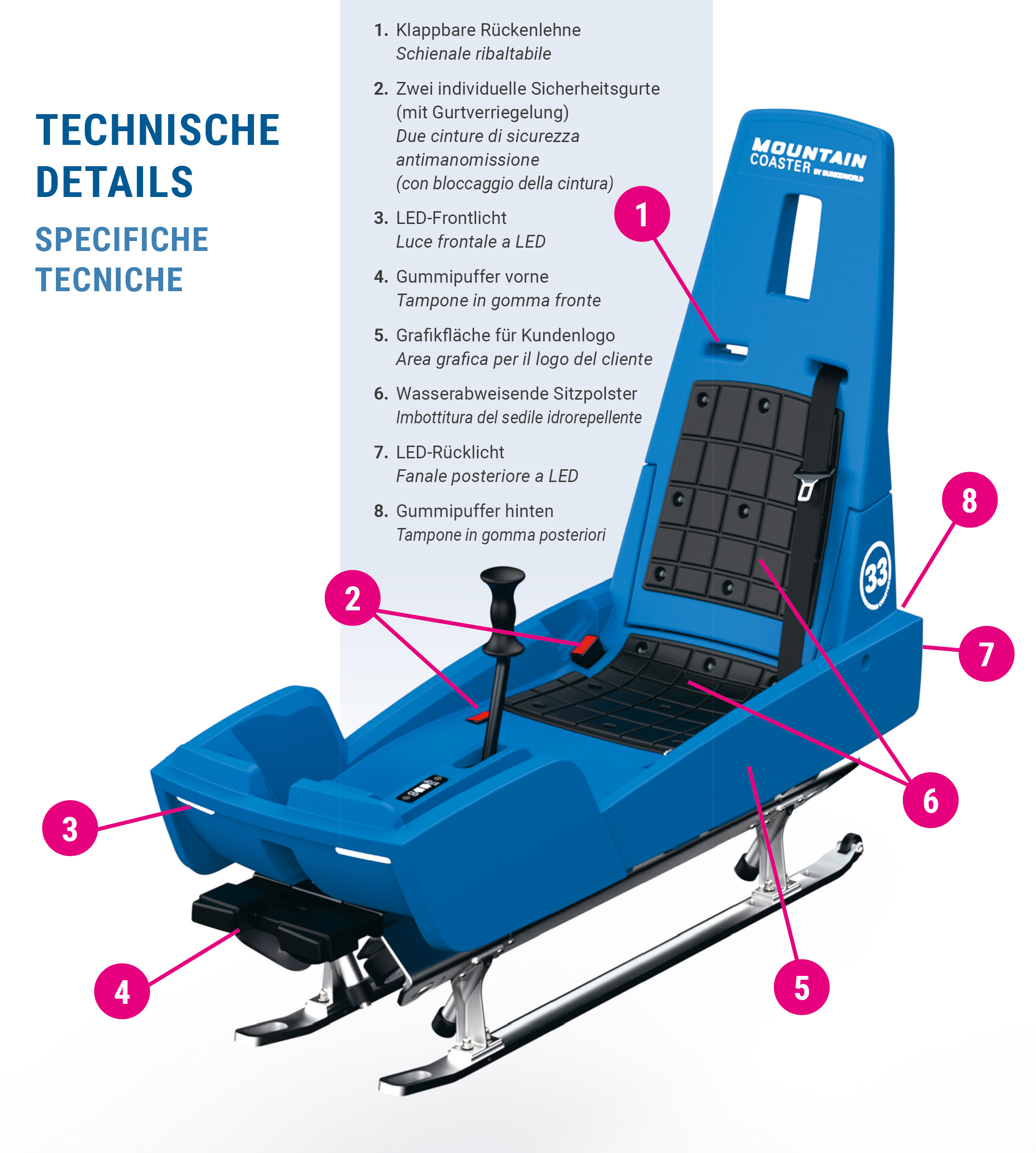 Jede Strecke wird ganz individuell gestaltet – vor allem hinsichtlich der Streckenelemente (Tunnel, Kurven, Jumps, Waves…) und der vom Kunden gewünschten Thematisierungen, wie beispielsweise der Fiss-Flitzer im Familien-Skigebiet Fiss (Tirol).
