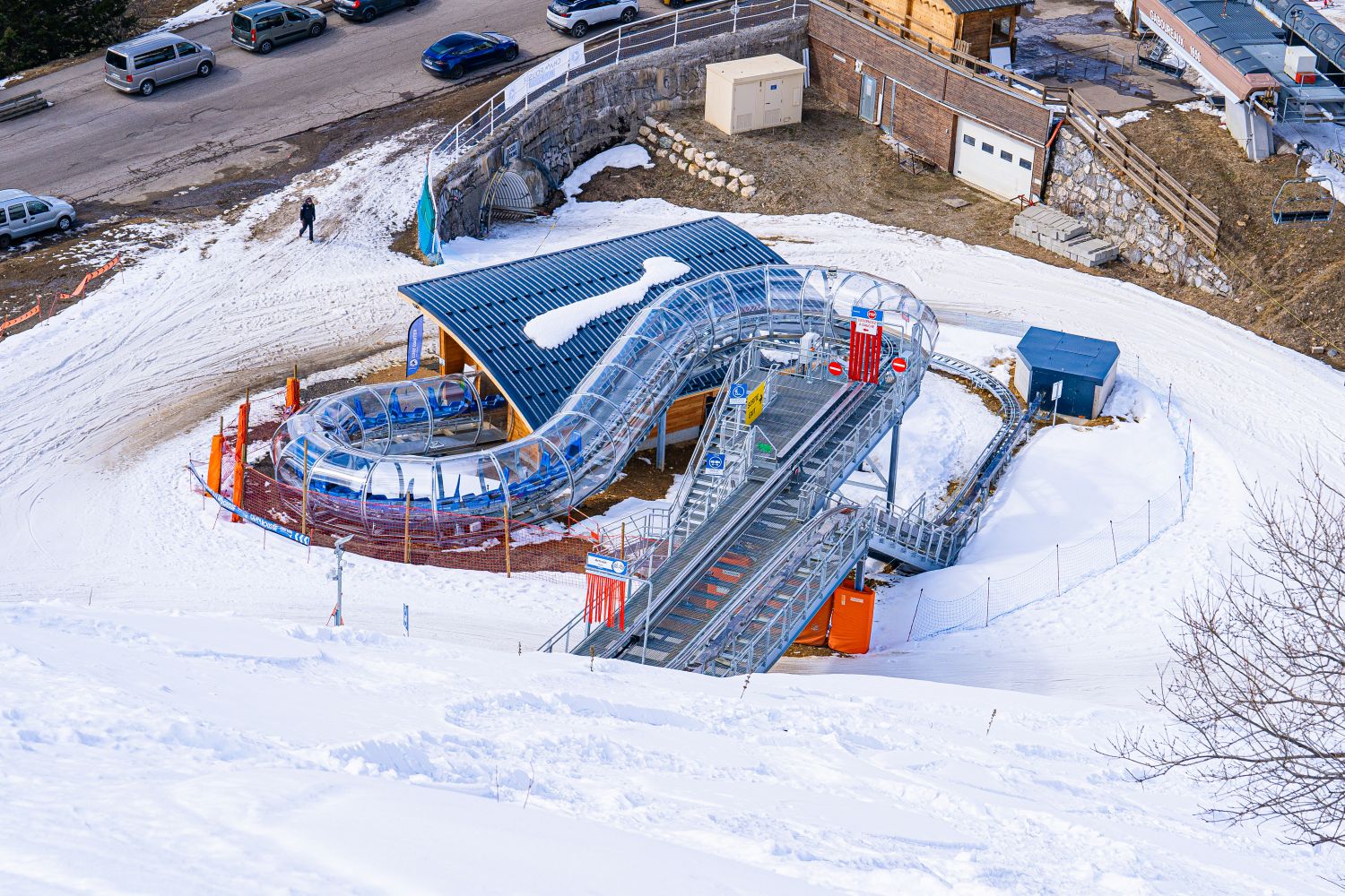 Der Transport zum Startbereich erfolgt – komfortabel für Betreiber wie Fahrgäste – mithilfe eines SUNKID-Bergförderers. Während ein Ausstiegsband den Ablauf am Ende der Strecke reibungslos gestaltet, schützt die überdachte Kreisel-Staustrecke die Fahrzeuge vor allen Witterungseinflüssen.