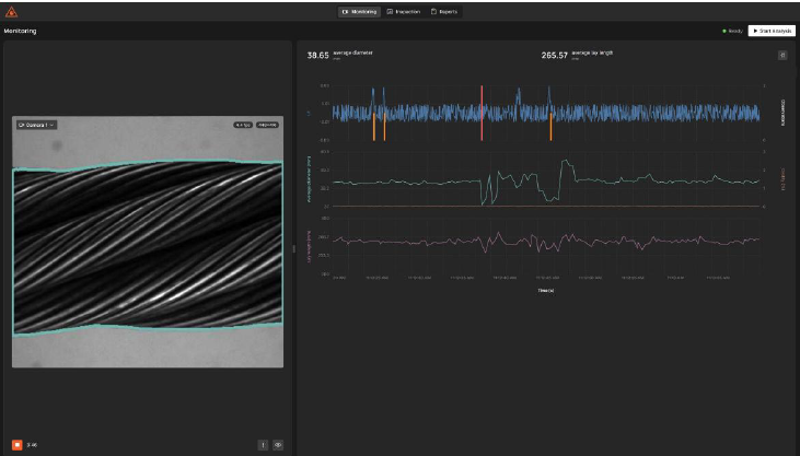 - Inspektionsmodus: Die Software analysiert einen vollständigen Seildurchlauf, rekonstruiert das Seil Schlaglänge für Schlaglänge und erzeugt eine komplette Übersicht mit Bildern, Statistiken, Lokalisierung von Anomalien und Konfidenzniveaus, um die Detektion von falschpositiven Ergebnissen zu minimieren und damit die Auswertezuverlässigkeit zu erhöhen. Benutzer können vom Gesamttrend des Seils bis hinunter zur einzelnen Schlaglänge zoomen, wo geometrische Werte und KI-erkannte Beobachtungen nebeneinander angezeigt werden.