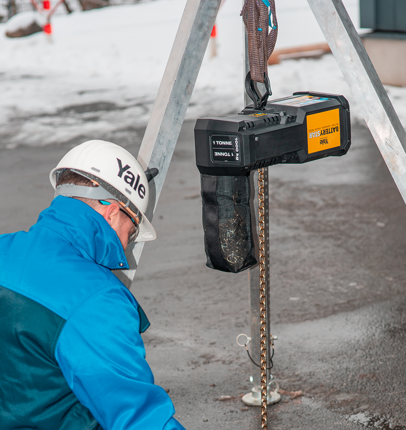 Der batteriebetriebene Yale BatteryStar ermöglicht flexibles Heben und Positionieren schwerer Lasten, auch in schwer zugänglichem Gelände.