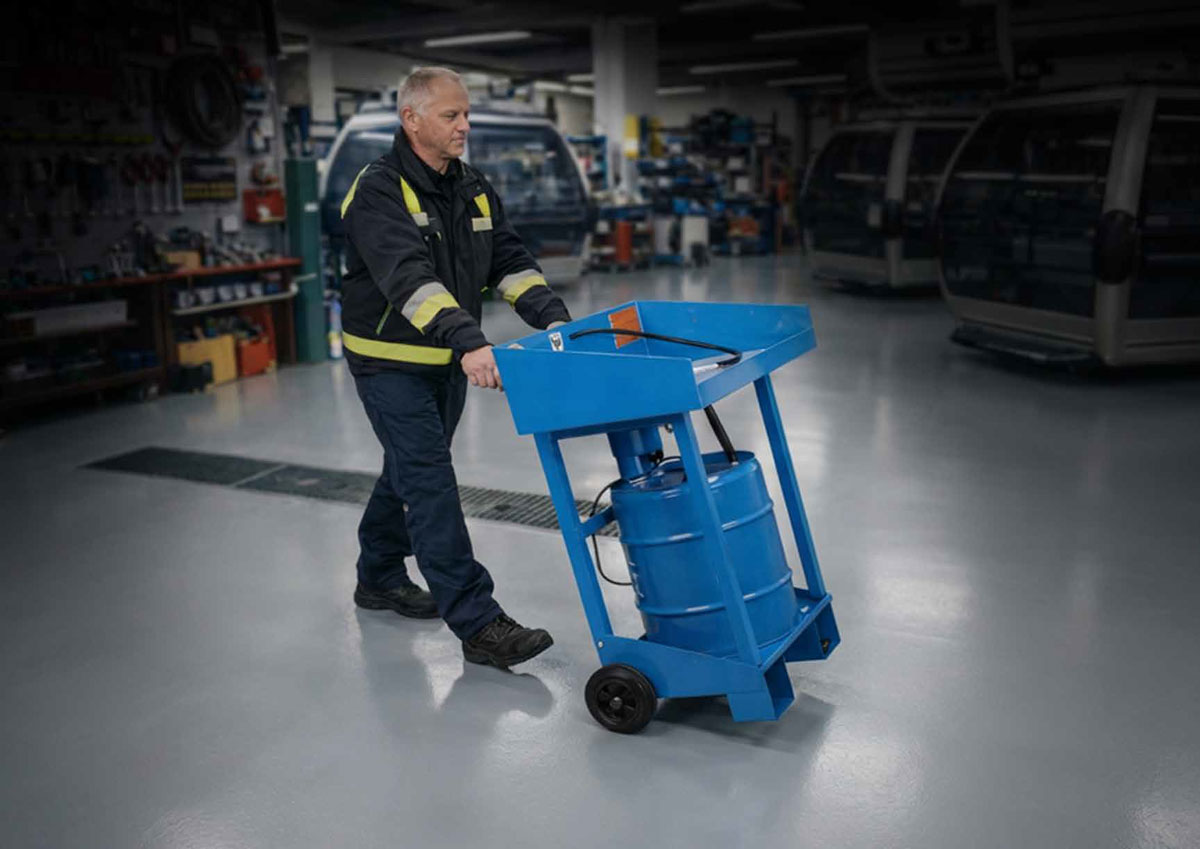 Typ 2 ist ebenfalls mit Deckel erhältlich (Leitfaden Brandschutz Seilbahnen) und arbeitet dermatologisch unbedenklich. Als optionales Zubehör ist die Auffangwanne verfügbar – zur sicheren Rückhaltung von Reinigungsflüssigkeiten und für zusätzlichen Umwelt- und Betriebsschutz.