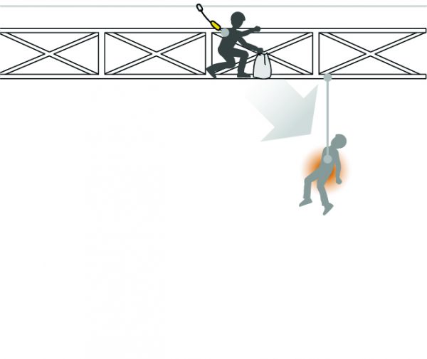 • Einen Verletzten eigenständig retten: Geeignete Lösungen zur Rettung der Höhenarbeiter müssen vor Arbeitsbeginn festgelegt werden. Bei der Installation der Arbeitsseile können lösbare Systeme vorgesehen werden, die eine Rettung von unten aus ermöglichen. Ein Höhenarbeiter darf auf keinen Fall alleine auf einer Baustelle arbeiten: Er kann sich zwar alleine in der Höhe aufhalten, jedoch muss eine für Rettungssituationen ausgerüstete und ausgebildete Person auf der Baustelle anwesend sein.