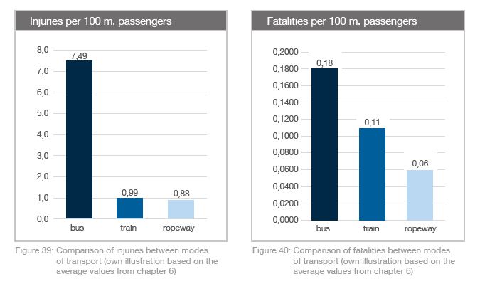 Seilbahnen stechen als das sicherste Verkehrsmittel hervor, mit sehr wenigen Verletzten oder tödlichen Unfällen. Die Zahl der tödlichen Unfälle liegt in fast allen Jahren nahe null, wobei einzelne Ereignisse die Statistik stark beeinflussen.